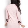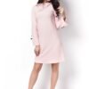 A simple, elegant dress with a classic, slightly trapeze cut. The dress has long sleeves, with a slit decorated with a satin bow.