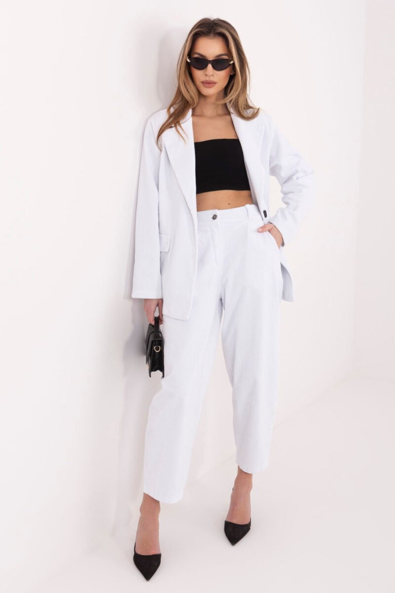 Fashionable women’s carrot corduroy pants that combine comfort with timeless, casual style. This is the perfect choice for everyday wear, they will work well in urban outfits as well as in more polished work ensembles. The model is made of high-quality cotton with added elastane, which ensures comfort and gentle material elasticity. The smooth pattern emphasizes the universal character of the pants, while the corduroy texture gives them a fashionable, slightly retro accent. The pants have a high waist that beautifully accentuates the waist and visually elongates the silhouette. The carrot cut with tapered legs provides freedom in the hips and thighs, while giving the overall look a modern shape. The zipper and button closure ensures comfort and a stable fit. Practical side pockets increase the functionality of the model. This is an excellent choice for women who appreciate comfort, style, and versatility in their everyday outfits.