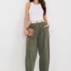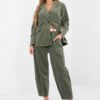 Stylish women’s corduroy trousers are a perfect choice for everyday, casual styling. The carrot style is characterized by a looser fit around the hips and tapered legs, ensuring comfort and a modern look. The high-waisted model beautifully accentuates the waist and visually elongates the silhouette. An elastic band is sewn into the waist, guaranteeing a comfortable fit without the need for fastening. An additional advantage is a fastened belt that highlights the waist and serves as a stylish finishing touch. The trousers do not have a classic fastening, which increases comfort. They are equipped with open, slip-in pockets sewn on the sides, practical and adding a casual character to the whole. Made of high-quality cotton and elastane blend, they are soft, pleasant to the touch, and slightly elastic, making them well-fitted to the silhouette. The smooth pattern makes the model versatile and easy to style, perfect for everyday wear, work, or meetings.