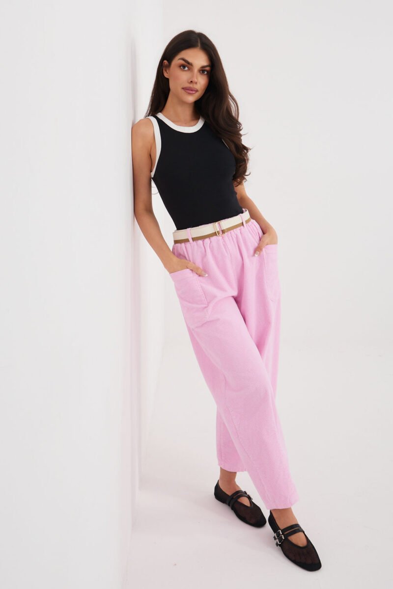 Stylish women’s corduroy pants are a perfect choice for everyday, casual styling. The carrot cut features a looser fit around the hips and tapered legs, providing comfort and a modern look. The high-waisted model beautifully accentuates the waist and visually elongates the silhouette. An elastic waistband is sewn in at the waist, ensuring a comfortable fit without the need for fastening. An added bonus is the fastened belt, which highlights the waist and adds a stylish finishing touch. The pants do not have a traditional closure, increasing comfort. They are equipped with open, slip pockets sewn on the sides, practical and adding a casual character to the whole look. Made from a high-quality blend of cotton and elastane, they are soft, pleasant to the touch, and slightly elastic, ensuring a good fit to the silhouette. The smooth pattern makes the model versatile and easy to style, perfect for everyday wear, work, or meetings.