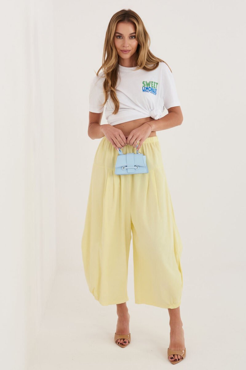 Women’s corduroy pants in a loose, Aladdin-style cut, perfect for everyday wear. Made of soft and pleasant to the touch cotton, they provide comfort and breathability. The model has a high waist and a waistband with elastic that adjusts to the silhouette and guarantees comfort throughout the day. Wide 7/8 length legs give the whole outfit a lightness and a fashionable character. The pants in a smooth pattern, without fastening and pockets, emphasize their minimalist style and relaxed, casual look.