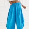 Women’s corduroy trousers with a loose, Aladdin-style cut, perfect for everyday wear. Made of soft and pleasant to the touch cotton, they provide comfort and breathability. The model features a high waist with an elastic band sewn in, which adjusts to the silhouette and guarantees comfort throughout the day. Wide 7/8 length trousers give the outfit lightness and a fashionable character. The trousers have a smooth pattern, without fastening or pockets, emphasizing their minimalist style and relaxed, casual look.