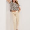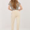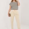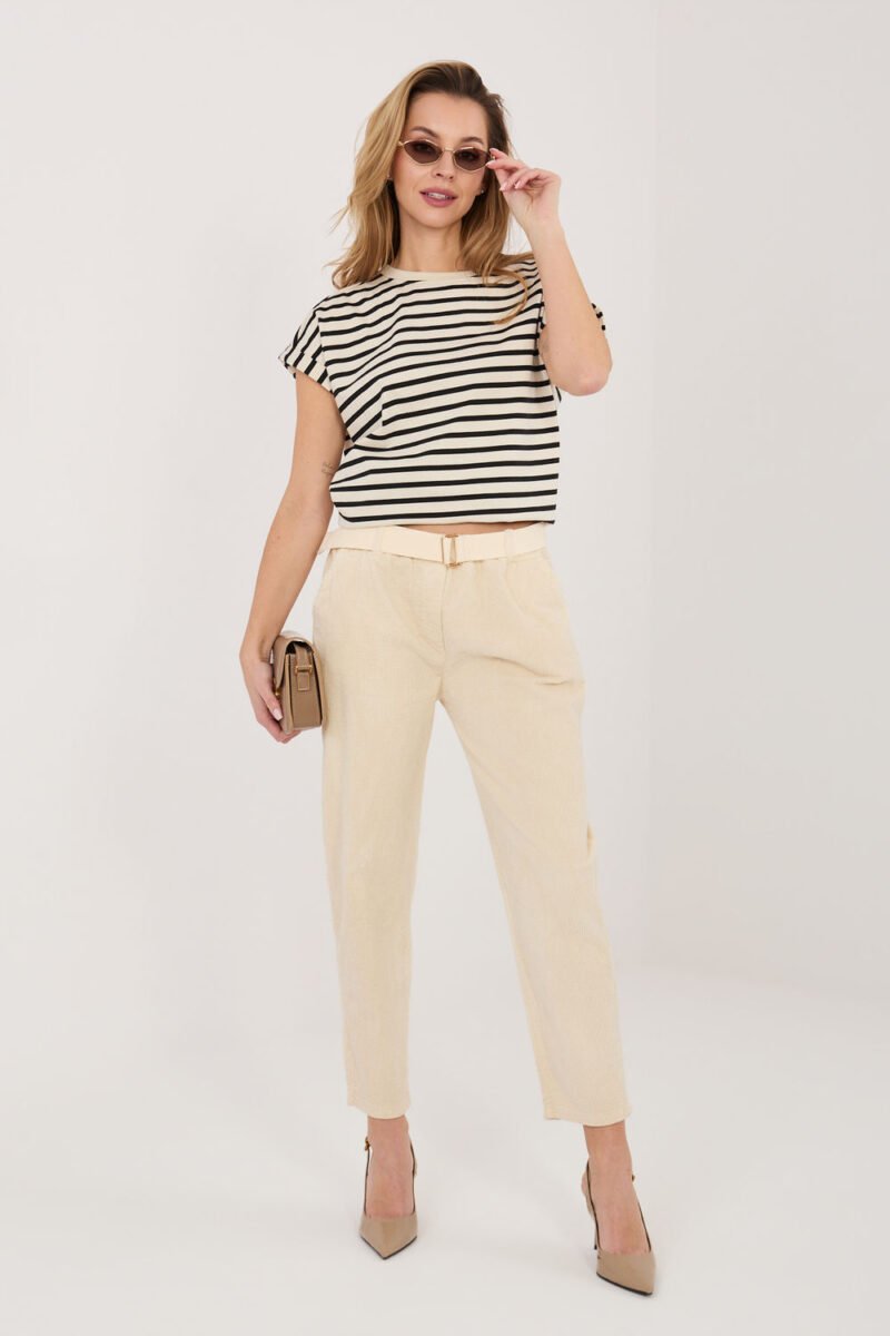 Women’s corduroy trousers in an elegant cigarette cut, which will work perfectly in everyday stylizations. Made of high-quality cotton and elastane blend, they provide comfort, flexibility, and perfect fit to the silhouette. The model with an elastic waistband guarantees comfort and freedom of movement, and the additional fastened belt emphasizes the waist and gives the whole a stylish character. Tapered 7/8 length legs visually slim the silhouette and give a modern look. Trousers in a smooth pattern, without a classic fastening, equipped with practical side pockets, combine functionality with timeless elegance.