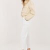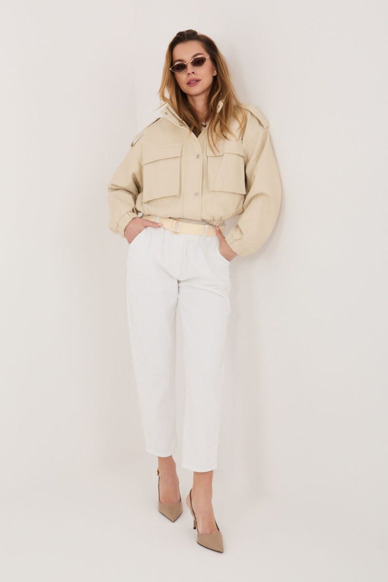 Women’s corduroy trousers with an elegant cigarette cut, which will work perfectly in everyday stylizations. Made of high-quality cotton and elastane blend, they provide comfort, flexibility, and perfect fit to the silhouette. The model with an elastic waistband guarantees comfort and freedom of movement, while the additional fastened belt emphasizes the waist and gives the whole a stylish character. Tapered 7/8 length legs visually slim the silhouette and give a modern look. Trousers in a smooth pattern, without a classic fastening, equipped with practical side slip pockets, combine functionality with timeless elegance.