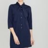 Mini dress made of soft fabric. A simple cut with 3 sleeves, fastened at the front with press studs. The plunging neckline is finished with a tied sash. Thanks to that the dress gains a more feminine character.