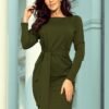 Dress with a wide belt, you can tie it both in front and at the back. Pleasant-to-the-touch fabric in a military khaki color. Brand numoco.