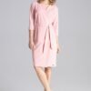 Classic dress with envelope neckline, zipped at the back. Model with elbow-length sleeves and decorative belt tied at the waist. Perfect for work or a business meeting.