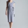 Grey midi dress with a v-neck, an elastic band at the waist. Additional fabric, tied belt. An asymmetrical slit on the left leg, unlined.