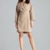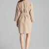 Beige straight, loose-fitting dress-jacket with classic lapels and no fastening. Tied at the waist with a belt with a decorative metal buckle in the color of gold. Jacket without pockets and without lining.