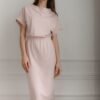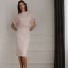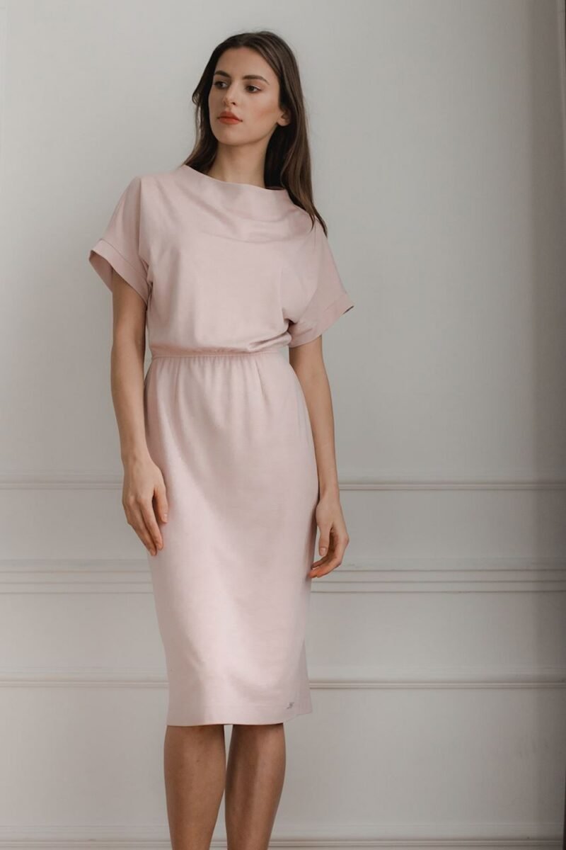 Pink midi dress, short sleeves falling to the shoulder with a cuff. Half-round neckline. Sewn-in elastic at waist. Fitted hem.