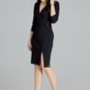 Black fitted midi dress with kimono 3/4 sleeves, envelope neckline. A decorative belt with buttons at the waist. A covered zipper at the side. A delicate slit at the front on the left leg.