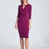 A fuchsia casual midi dress with an envelope neckline finished with a piping embellishment, darts emphasizing the bust, stitched and creased at the waist. Fastened at the back with a long covered zip.