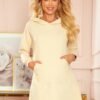 Amelia, warm long kangaroo sweatshirt with hood in beige color. Sweatshirt can also be worn as a dress. Cotton material. Made in Poland. Made by numoco.