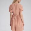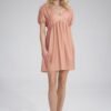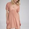 Loose-fitting dress to the knees, with a sweetheart neckline, pleated under the bust, and short buffet sleeves with elastic band. Dress tied at the back with a fabric belt, without pockets and fastening.