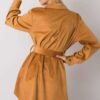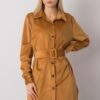 Camel button-down dress with long sleeves. A belt completes the look.