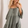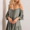 Summer dress with asymmetrical cut, straps, 3/4 sleeves, adjustable straps, tied neckline. Dress with frills, ideal for many occasions.