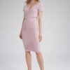 Fitted summer midi dress with short sleeves. Cheese neckline at the front and back, vertical elastic band sewn into the fabric along the entire length of the front and back.