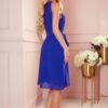 Chiffon dress with belt and tie at back. Dress in cornflower blue. Brand numoco. Made in Poland.