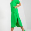 Short-sleeved dress with slip pockets on the sides. Rounded bottom with slits.