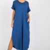 Short-sleeved dress with slip pockets on the sides. Rounded bottom with slits.