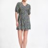 Summer mini dress with patterned buttons. Cheese neckline, short, loose sleeves with elastic band, slightly flared at bottom.