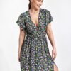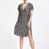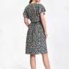 Summer midi dress with an envelope neckline and decorative binding, short ethereal sleeves. Waist with sewn-in elastic band. Decorative slit on the side. Unlined, unbuttoned, without pockets.