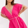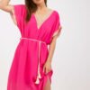 Loose-fitting dress with short sleeves and a heart neckline. Dress is lined, tied at the waist. Dress with openwork inserts.