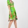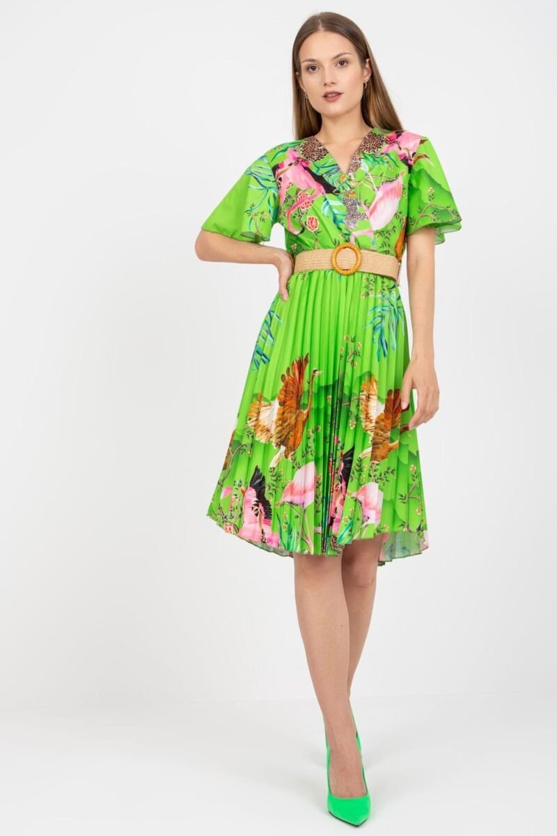Summer dress with short sleeves, an envelope neckline and a flared bottom. Pleated bottom of dress. Dress with a braided belt included. Ideal for many occasions.