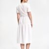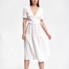 Summer midi dress with short sleeves, envelope neckline with decorative binding on the side. The dress has a flared cut, a covered zipper, and no pockets.
