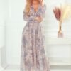 Chiffon midi dress with neckline and long sleeves. Dress made of fabric with a beige-blue pattern. Polish production. Numoco brand.