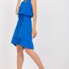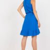 Summer dress with a flared cut without sleeves. The dress has an asymmetrical hem decorated with a ruffle, and a sweetheart neckline. The waist is additionally tied at the waist.