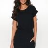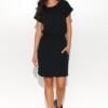 Short dress made of sweatshirt knit fabric. Comfortable casual creation with a drawstring waist. It has two side slip pockets. At one of them a charming gold plate is present. The round neckline and short sleeve give the dress minimalism and versatility. This is an extremely graceful everyday creation that you can style in many ways. For sporty, elegant and business – as you like. Wear it with sneakers, pack a lightweight women’s blazer and go shopping with friends or take the kids on a spontaneous picnic. In any situation this dress will work perfectly.