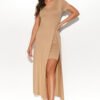 A beautiful dress sewn from a lightweight viscose knit fabric. It has two layers, the top one is longer and has a fine slit. Underneath, a mini part is visible, sewn closer to the body. The dress has short sleeves and a heart neckline. It makes an extraordinary impression, while remaining an extremely comfortable everyday creation. You can match it with a simple chain or play with more daring accessories. On the back of the dress is sewn a patch with the Numinou logo. Wear it with gold sandals and make an impression during a romantic dinner.