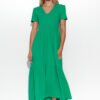 Dresses are undoubtedly one of the most feminine parts of a woman’s closet. No wonder, they are the ones that add allure and girlish charm. The maxi knit dress was sewn in a very classic cut, which turns almost every woman into an hourglass. Comfortable knit fabric provides a feeling of freedom, short sleeves cover the shoulders in their widest areas. The v-neckline elongates the neck, while the hem around the waist emphasizes the slimmest area of a woman’s figure, adding lightness. Light ruffles, located in several places along the length of the dress, will add a romantic touch to any styling with this creation in the lead role. Maxi dress in a solid color does not need many accessories, although it will also gladly accept many of them. For sporty, with your favorite kidney and sneakers, or elegant, with stilettos and a clutch bag.