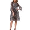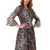 An ethereal chiffon dress with a tie at the neckline is an option for work and vacation. The dress has elbow-length sleeves and is lined.
