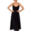 Loose-fitting midi dress with thin straps and decorative ruffle at the neckline. The dress has a flared cut, fastens with a covered zipper, and is unlined.