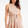 Loose, flared dress with decorative neckline crease. The collar fastens at the back with a button. Can be worn two ways, as an airy A-line dress, or tied at the waist with a belt made of the same material as the dress. Designed and sewn in Poland.