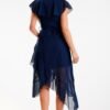 Elegant dress with an asymmetrical cut. The bottom of the dress is decorated with a ruffle, which is beautifully arranged when walking. The ruffle at the neckline falls to the shoulders. V-neck neckline. Fastened on the side with a covered zipper. The dress is fully lined. The product is made in Poland.