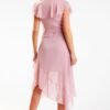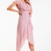 Elegant dress with an asymmetrical cut. The bottom of the dress is decorated with a ruffle, which is beautifully arranged when walking. The ruffle at the neckline falls to the shoulders. V-neck neckline. Fastened on the side with a covered zipper. The dress is fully lined. The product is made in Poland.