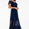 A maxi dress with a Spanish-style neckline. The top of the dress is decorated with a ruffle. An elastic band accentuates the waist. The dress is sewn from airy chiffon, which beautifully arranges itself when walking. The bottom of the dress is lined. Designed and sewn in Poland.
