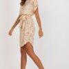 Summer dress with short sleeves and a round neckline. At the waist a belt for tying. Dress made of fabric in an interesting floral pattern.