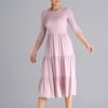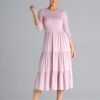 Midi dress with 3/4 sleeves, fitted at the waist. From the waist down three crinkled ruffles. Dress worn over the head.