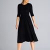 Midi dress with 3/4 sleeves, fitted at the waist. From the waist down three crinkled ruffles. Dress worn over the head.