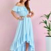 Asymmetrical maxi dress is made of soft, pleasant fabric that will provide comfort to the most demanding women. The dress is worn over the head. It is also characterized by uncovered shoulders that add to its elegant look and an asymmetrical bottom finished with a beautiful ruffle. The dress is distinguished by an elastic waistband that perfectly emphasizes the feminine curves. Maxi dress with uncovered shoulders will perfectly suit any type of beauty because it has a large range of colors. The dress will also excel in elegant styling. Therefore, it is ideal for women who appreciate the versatility of clothing. The product is manufactured and sewn in Poland.
