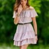 The short dress with off-the-shoulder design and ruffles is made from a smooth fabric that is soft and pleasant to the touch, ensuring comfort in wear. The mini dress features elastic at the neckline to prevent slipping off the shoulders and at the waist, beautifully accentuating it. The attached ruffle adds lightness, while the frills at the bottom of the dress enhance its feminine charm. The off-the-shoulder dress is an ideal choice for those who appreciate a sporty style as well as for those who value an elegant appearance. Well-chosen accessories will complement the styling, as they can make the look either elegant or sporty. The solid colors and their rich range allow for the creation of the desired look. The product is made and sewn in Poland.