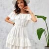 The short dress with open shoulders and ruffles is made of smooth fabric that is soft and pleasant to the touch, so it will be comfortable to wear. The mini dress has an elastic band at the neckline, which inhibits the fall from the shoulders, and at the waist, which it emphasizes beautifully. The attached ruffle adds lightness and the ruffles at the bottom of the dress add a girly touch. The dress with open shoulders will be an ideal choice for ladies who like a sporty style and for those who appreciate an elegant look. Complementing the styling will be well-chosen accessories, because it is thanks to them that the Spanish dress will be elegant or sporty. Uniform colors and their very rich range allow you to create the look of your dreams. The product is manufactured and sewn in Poland.