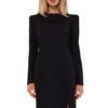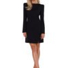 Dress with long narrow sleeves and modeling stitching on the front. The dress is unlined and fastened with a covered zipper. Stitching on the shoulders with sewn-in high cushions. Designed and sewn in Poland.