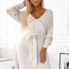Openwork dress with long sleeves, neckline and binding. Made of sweater-like warm material in beige color. It can also be worn over one shoulder. European production. Brand numoco basic.