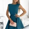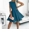 A flared dress with small sleeves and a belt. Made of smooth fabric in a fashionable sea color. Fastened at the back with a zipper. Brand numoco. Polish product.