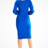 Elegant, fitted dress with long sleeves ending in buffets and buttoned cuffs. The dress has decorative pleats on the front and an opening at the bottom. Fastened at the back with a covered zipper.